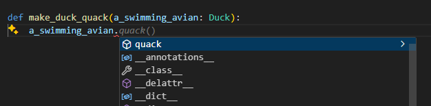 I przekażemy jej instancję do funkcji, to “quack” będziemy musieli napisać z palca. Bo w końcu skąd ten biedny edytor ma wiedzieć, że pływający ptak to właśnie kaczka?
